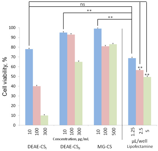 - The toxicity of DEAE-CS rises with increasing concentrations of the polymer and its DS, whereas MG-CS demonstrates only moderate cell toxicity, even at the highest concentration studied.