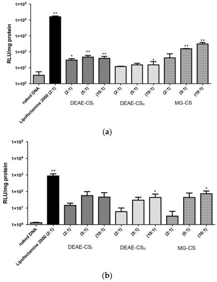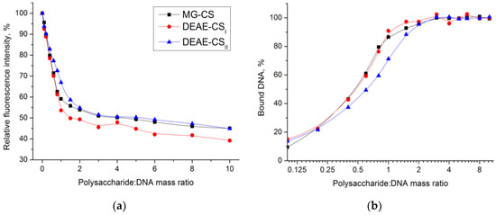 - Both DEAE-CS and MG-CS efficiently bind DNA to form stable self-assembled polyplexes at polysaccharide:DNA ratios greater than 2:1. The stoichiometry of the polyplexes was about 1:1.