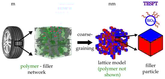 Hierarchy of scales. The polymer matrix within an elastomer composite, here exemplified by a tyre tread material, is reinforced by an embedded filler network. In the current model, the filler particles are approximated by cells on a cubic lattice (coarse graining). The different coloured faces are either representing bare particle surface areas (blue) or silanised areas (red). A specific example are silica particles silanised with TESPT.