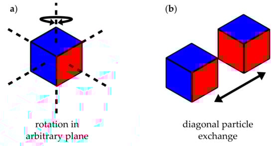 Illustration of MC moves. (a) particle (cube) rotation; (b) neighbouring particle exchange.