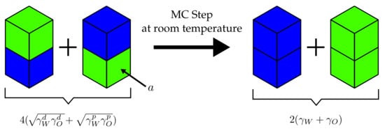 It is useful to consider the example depicted in Figure 3. The four cells, two corresponding to water and two corresponding to oil, initially possess two mixed interfaces for which . Subsequently, the cells are rearranged so that the water(w)–oil(o) interfaces are replaced by water–water (j = ww) and oil–oil (j = oo) interfaces. The attendant is given by