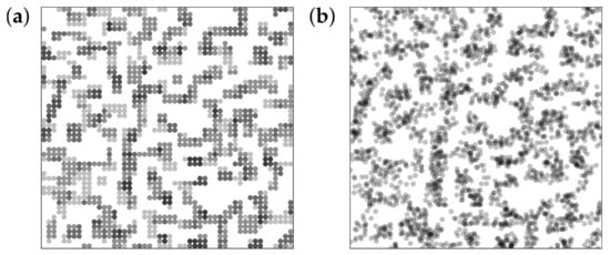 Transmission electron micrograph images are generated from slices, five cells thick, extracted from the system after a certain number of MC steps. An example is shown in the left panel of Figure 4. Grey circles correspond to filler cells on the lattice. The shading becomes darker when filler cells are stacked along the line of sight. In order to increase the similarity to experimental TEM slices, it is useful to apply small random displacements to the circles. The maximum displacement in any direction is times the lattice spacing (Note that the same procedure precedes the calculation of scattering intensities). Applying this to the aforementioned slice in Figure 4, we obtain the right panel.