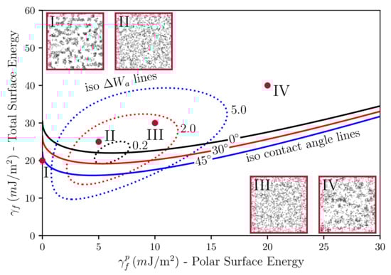 Equation (9) is due to Owens and Wendt [] (cf. Equation (7) in their paper), who developed it drawing on earlier work by Fowkes []. The subscripts p and f stand for polymer and filler, respectively. In their original work, Owens, Wendt and Fowkes focus on the wetting behavior of liquids on solid surfaces. Here, we equate the liquid with the polymer and the solid with the filler (note that in Ref. [] the authors equate the liquid with the filler and the solid with the polymer. Notice also that Equation (9) is not symmetric with respect to this exchange.). The quantity is the contact or wetting angle of a liquid drop on a planar solid substrate in the well-known Young equation. The solid lines in Figure 5 are obtained by solving Equation (9) in the --plane keeping the quantities , and fixed. Increasing -values corresponds to decreasing wettability (or compatibility). In addition, the dashed closed loops in the figure are lines of constant work of adhesion between the polymer and the filler (for fixed values of and ). Note that work of adhesion, , is defined as the free energy change, or reversible work, to separate a unit p-f-interface from contact to infinity (e.g., []), i.e., . Here, we are interested in the change of the work of adhesion, , which is given by . This really is a difference of (reversible) works of adhesion, because the intermediate states, corresponding to the separated interfaces, cancel. is given by Equation (7) if we replace the subscripts by , respectively, and set a equal to the unit area. is the driving force for flocculation/reagglomeration according to Wang []. Moving away from the central loop means larger values of and a correspondingly stronger tendency for the filler to flocculate.
