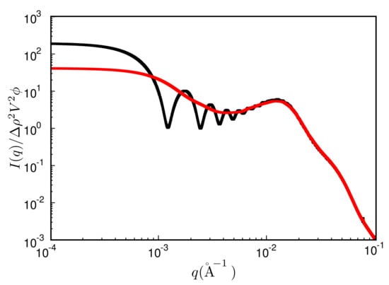 Reduced scattered intensity vs. magnitude of the scattering vector, q. Black: result obtained from a single MC configuration generated in a cubic box with periodic boundaries; red: result obtained after the averaging procedure explained in the text. System ingredients are the same as in Figure 4 but with a filler content of . The temperature is C.