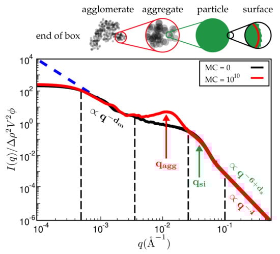 Reduced scattered intensity vs. magnitude of the scattering vector, q. The figure depicts the different q-regimes. The limit of large q is governed by Porod’s law or, in the case of fractal particle surfaces, by the attendant law exhibiting a fractal dimension. Subsequent q-regimes contain information on the size of the particles, their aggregates and the filler network itself. Due to the finite size of the simulation cell, there is a plateau terminating useful information at small q. The observed structure of course depends on the number of MC steps. System ingredients used here are the same as in Figure 4. The filler volume content is and temperature is C.