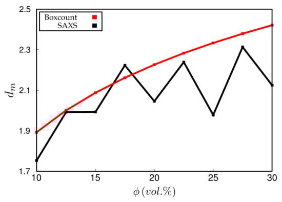 Experimentally, is obtained via the slope of vs. at small q. Simulated scattering intensities can be analysed analogously. However, both the limited system size as well as the average over a distribution of boxes of variable size can and will affect the value of . However, in the simulation, can be also measured directly using, for instance, a box-counting algorithm. This means that the system is partitioned into cells. Whenever a cell contains at least one particle, it is considered occupied. Plotting the logarithm of the number of occupied cells, , vs. , should yield a slope equal to for sufficiently large n. Figure 8 compares the values of obtained by both methods for systems containing different amounts of filler. Notice that the system size is quite large in this case, i.e., the lattice dimension is . The numerical uncertainty of both methods is comparable, even though the box-counting algorithm appears to be smooth. The averaging over boxes of different size, as explained in the context of Figure 7, tends to reduce the slope of the scattering intensity in the q-regime where is determined. This is why the box-counting algorithm yields somewhat large values for the fractal dimension. In a recent work by Mihara et al. [], the authors study flocculation in silica-filled rubber using small-angle X-ray measurements. Their fractal dimensions tend to be larger than the ones obtained here. For instance, using the conventional silica VN3, their increases from about 2.6 to 2.7 when the silica content increases from 60 to 80 phr. This corresponds to being roughly between 15% and 20% (vol.) in our case and thus the increase at least is comparable. Nevertheless, it is difficult to compare this conclusively because the general system compositions differ. Still, it is worth mentioning that Schneider [] obtains mass fractal dimensions in the aforementioned system of U7000/Si69 (cf. the above discussion of Figure 6) in natural rubber between 2.5 and 2.6 when the filler content is about 20% (vol.). Mass fractal dimensions comparable to ours, i.e., around 2.3, are obtained by Koga et al. [], albeit for (styrene-random-butadiene) copolymer (SBR) as well as polyisoprene (PI) loaded with 20% (vol.) carbon black.