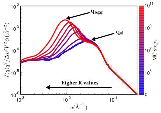 In the following, we discuss a number of examples illustrating the approach. In order to study aggregate formation, it is useful to multiply the scattering intensity by an extra factor (Kratky-plot). Figure 9 shows the reduced intensity using this Kratky-representation. Notice that the height of the aggregate peak increases and also shifts to smaller q-values with an increasing number of MC steps. At the beginning of the MC, only the particle-peak is present. Subsequently, the MC generates continuously growing aggregates for this particular system.