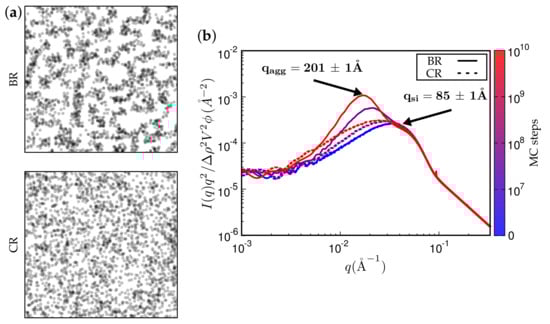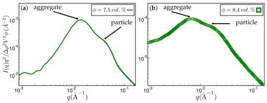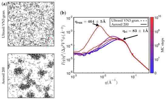 Approximate comparison between simulation and experiment. (a) Kratky representation of the scattered intensity obtained via simulation after MC steps on a 256 × 256 × 256 lattice. The system has the same ingredients as in Figure 4. The filler volume fraction is % and the temperature C. The mean particle size quoted in the literature is Å. The aggregate size corresponding to the aggregate peak is about 202 Å; (b) experimental scattering curve taken from Ref. [] for styrene-butadiene rubber (SBR) filled with Zeosil 1165 MP. The filler volume fraction is % and the temperature used to create this compound is C. The particle and aggregate sizes according to the attendant peaks are 139 Å and 402 Å, respectively.