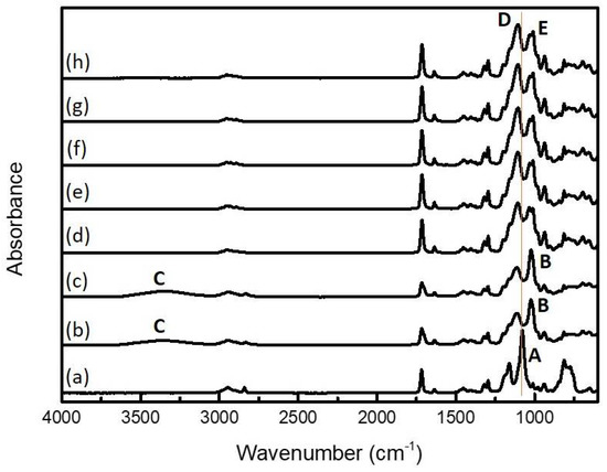 FT-IR spectra of LMO during sol–gel reaction: (a) MPTMS silane before sol–gel reaction; hydrolysis (b) 30 min and (c) 1 h; condensation (d) 1 h; (e) 2 h; (f) 3 h; (g) 6 h; and (h) 72 h.