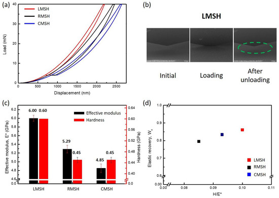Mechanical properties of LMSH, RMSH, and CMSH with nano-indentation test. (a) Load versus indenter displacement for the methacrylate siloxane hybrid materials; (b) SEM images of the LMSH during nano-indentation test. The green dashed line is indicated the loading area, the impression is almost recovered after nano-indentation test (Video S1); (c) a plot of effective modulus and hardness data, in situ calculated during nano-indentation test; (d) a plot of the elastic recovery versus hardness-to-effective modulus ratio. The elastic recovery is derived by integrating the graph.