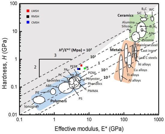 An Ashby map of hardness versus effective modulus for wear resistance. The LMSH only exists in the upper shaded area (H/E* 1). Values for other synthetic methacrylate-phenyl ladder-like polysilsesquioxanes are given in [31].