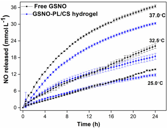 Figure 4 shows the NO release profile from free GSNO and from GSNO-PL/CS hydrogel at different temperatures (25, 32.5 and 37 °C) for 24 h. As the stability of GSNO is known to be dependent on the temperature [39], the NO release profile was monitored at room, skin and physiological temperatures (25, 32.5 and 37 °C, respectively). Figure 4 shows that both GSNO in aqueous solution, and GSNO incorporated into the hydrogel matrix, were able to release NO for at least 24 h at the different tested temperatures. In addition, the increase of the temperature increased the rates of NO release from both aqueous GSNO and hydrogel containing GSNO. This result is in accordance with previous publications [7,9,22,30].