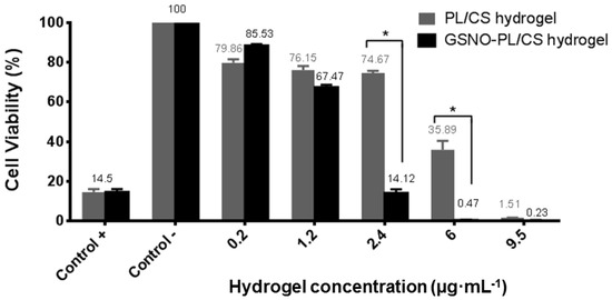 Both MIC and MBC values for PL/CS hydrogel were found to be 2.1 µg·mL−1, whereas both MIC and MBC values for GSNO-PL/CS hydrogel were found to be 0.5 µg·mL−1 (this concentration corresponds to 1 mmol·L−1 of GSNO) (Table 2). The sole PL/CS hydrogel had a bacterial effect; however, the incorporation of GSNO into the hydrogel decreased both MIC and MBC values by four times. Thus, as expected, the PL/CS hydrogel demonstrated antibacterial activity (due to the presence of CS), and this activity was enhanced by GSNO incorporation into the hydrogel matrix. Interesting, by comparing Table 2 and Figure 6, the hydrogel concentration required to achieve an anti-bacterial effect was not found to be cytotoxic (as related to a cytotoxicity pattern in Vero cells). Therefore, there is a concentration range that the GSNO-containing PL/CS hydrogel that can be safely administered to the patient, without damaging mammalian cells, and with a promising antibacterial effect.