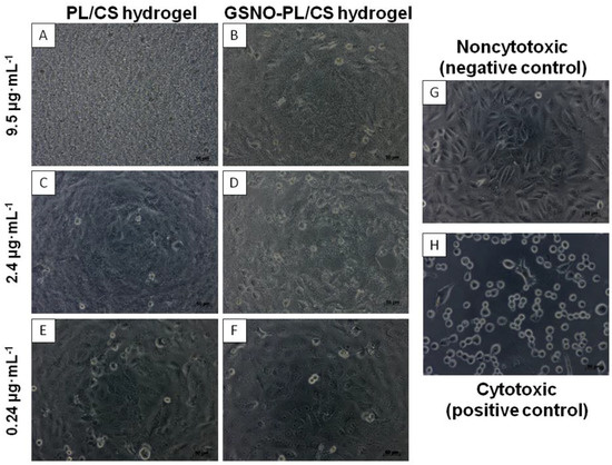Morphological characterization of Vero cells incubated with PL/CS hydrogel (first column) and GSNO-PL/CS hydrogel (second column) at 9.5 µg·mL−1 ((A,B), respectively), 2.4 µg·mL−1 ((C,D), respectively) and 0.24 µg·mL−1 ((E,F), respectively) for 24 h. Control samples (third column) of non-cytotoxicity (G) and cytotoxicity (H).