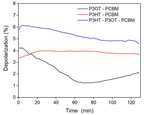Moreover, the value of the depolarization coefficient depends on the variation of the refractive thin film’s refractive index. This effect is caused by various crystalline phase fractions embedded in the amorphous medium. It is obvious to expect that a higher degree of crystallinity will give rise to a higher depolarization. In our case, the analysis of depolarization is justified because (assuming low film roughness) the higher depolarization value can partly come from crystallites randomly oriented in the film bulk and partly from the optical anisotropy of entire films. The depolarization coefficients are presented in Figure 1. The strong non-directional scattering observed in the reflection (discussed in detail here) assured us that in the main part of the layers there was an amorphous phase mixed with a smaller amount of polycrystalline phase. Thus, films can be represented by a single refractive index and an extinction coefficient. As is shown in Figure 1, the largest depolarization was exhibited by the ternary P3HT-P3OT-PCMB sample. The most thermally stable film was P3HT-PCMB, for which the depolarization coefficient was practically constant in the whole heating and cooling process.