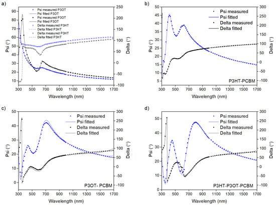 Spectral dependence of ellipsometric angles measured for (a) P3OT and P3HT; (b) P3HT/PCBM blend; (c) P3OT/PCBM blend; and (d) P3HT/P3OT/PCBM blend thin films. The results were recorded at an incidence angle of 70°.