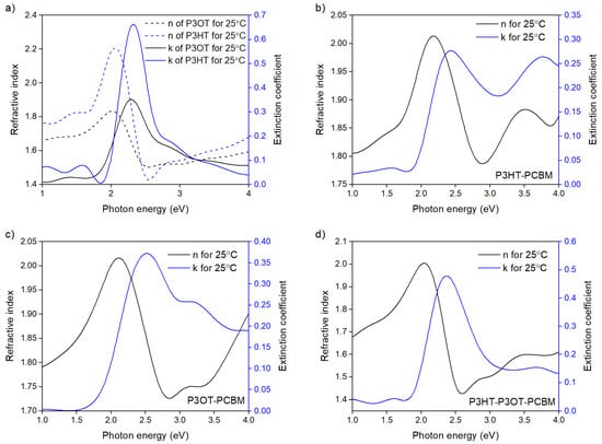 Dispersion of refractive index and extinction coefficient obtained at 25 °C for (a) pure P3OT and P3HT; (b) P3HT/PCBM blend; (c) P3OT/PCBM, blend and (d) P3HT/P3OT/PCBM blended thin films.