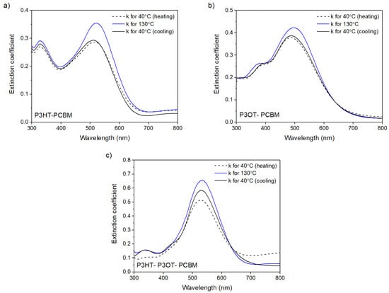 Dispersion of extinction coefficient determined for polymer blends (a) P3HT/PCBM; (b) P3OT/PCBM; and (c) P3HT/P3OT/PCBM at different temperatures during heating and cooling of the samples.