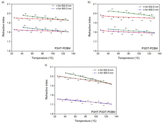 Temperature dependencies of refractive index for (a) P3HT/PCBM; (b) P3OT/PCBM; and (c) P3HT/P3OT/PCBM are presented for two wavelengths: 632.8 and 900 nm.