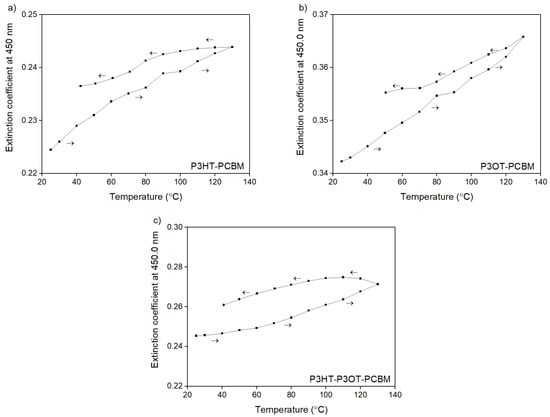 Temperature dependencies of extinction coefficient for (a) P3HT/PCBM; (b) P3OT/PCBM; and (c) P3HT/P3OT/PCBM blend films determined for the wavelength 450 nm.