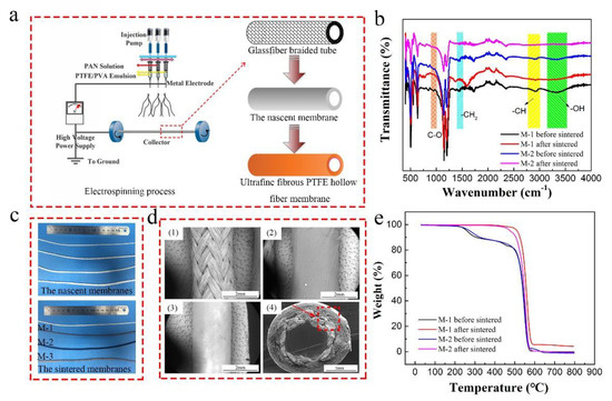 (a) Schematic diagram of the preparation process; (b) Fourier-transform infrared (FTIR) spectra of prepared membranes; (c) Photos of nascent and sintered hollow fiber membranes; (d) SEM images of (1) porous glassfiber braided tube; (2) the nascent membrane; (3) the sintered membrane; (4) the whole cross-section of the sintered membrane; (e) Thermogravimetric (TG) curves of prepared membranes.