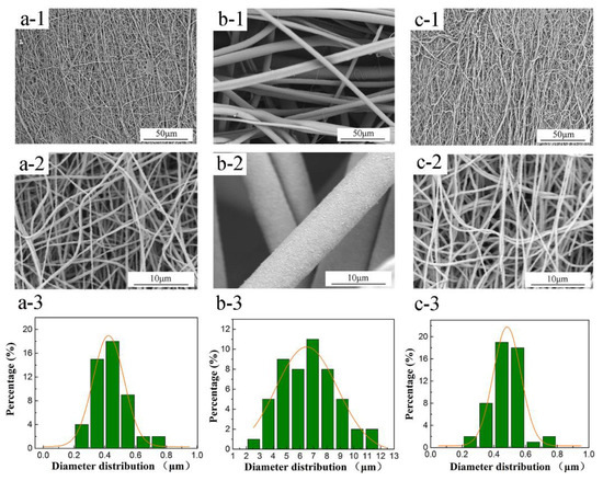 Fourier-transform infrared spectroscopy (FTIR, Nicolet iS5, iD7 ATR, Thermo Fisher Scientific, Madison, WI, USA) was used to identify the surface chemistry composition of the ultrafine fibrous membranes before and after sintering. The crystalline phases of the samples were confirmed by X-ray diffraction (XRD, D8 Discover, Bruker, Karlsruhe, Germany), with the diffraction angle 2θ having a value from 10° to 45°. The standard thermogravimetric (TG) analysis was completed using a thermogravimetric analysis instrument (TA-SDT Q600, TA instruments, New Castle, DE, USA) (air atmosphere, heating rate: 5 °C/min, 25–800 °C).