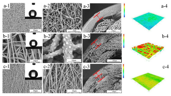 After the sintering process, as shown in Figure 3, the highly interconnected porous ultrafine fibrous network was formed. The cross-section morphologies of the prepared membranes showed that there was an obvious effect of boric acid on the morphology of the outer layer. Compared with M-1, M-2 showed a porous outer layer and a better interfacial bonding state because of the enhancement of the spinning solution viscosity. However, it can be seen from Figure 3(b-3,b-4) that the outer layer became looser and rougher, which was consistent with the results of mean pore size and LEPw values (Table 2).