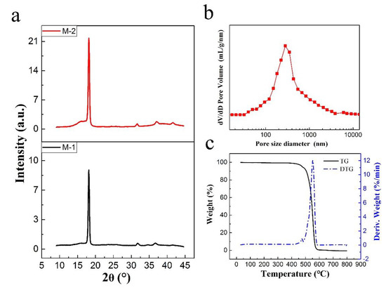 (a) XRD patterns of the sintered PTFE hollow fiber membranes, (b) Pore size distribution, and (c) TG and derivative thermogravimetry (DTG) curves of the sintered M-3 membrane.