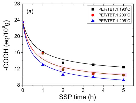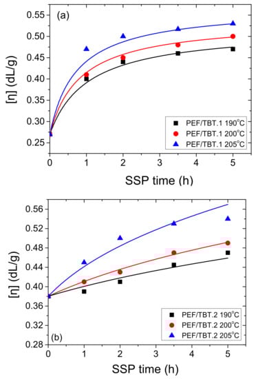 The effective method used herein to increase the molecular weight of PEF involves the application of one SSP for 6 h at 205 °C, followed by a remelting step of the obtained polyester for 15 min at 250 °C, and thereafter, a second SSP reaction was applied at different reaction times (1, 2, 3.5, and 5 h) and temperatures 190, 200, and 205 °C, under vacuum. The resulting PEF polyesters are labeled as PEF/TBT.3.