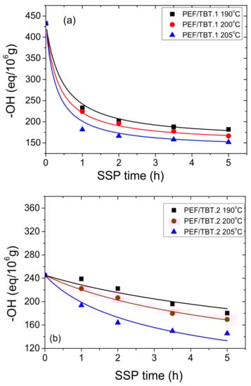 Moreover, end-group analysis (–COOH and –OH) was performed on all prepared samples. Figure 3 and Figure 4 show the effect of SSP time and temperature on the –COOH and –OH concentrations of all PEF/TBT samples. It is obvious that the carboxyl and hydroxyl contents decrease with increasing SSP time and temperature, wherein at low SSP temperature (190 and 200 °C), carboxyl end-groups content decreases almost linearly with the SSP time, while it begins to sharply deviate from the linear relationship at 205 °C. Carboxyl end-groups start at approximately 24 eq/106 for both PEF/TBT.1 and PEF/TBT.2, and after 5 h of SSP, depending on the temperature, reach values ranging from 9 to 12 eq/106 and 11 to 14 eq/106 for PEF/TBT.1 and PEF/TBT.2, respectively. Moreover, it was expected that PEF/TBT.3 samples should exhibit a content of carboxyl end-groups much lower compared to those of other PEF/TBT samples, due to their much higher molecular weights. However, this was not the case, as a high COOH concentration of 46.9 eq/106 was obtained after remelting. After 5 h of SSP, the carboxyl content was reduced to 32–37 eq/106 depending on temperature. The main reason for these high values could be the existence of degradation reactions, which take place principally at high temperatures in the melt phase, wherein a high amount of carboxyl end-groups have been easily created. Accordingly, the major degradation reaction responsible for the generation of carboxyl ends happened mainly via the cleavage of an ester bond in the PEF main chain producing vinyl ester and carboxyl end-groups. More impressive results were observed when calculating the hydroxyl content, which in the case of PEF/TBT.1 and PEF/TBT.2, start at high amounts, i.e., 433 and 245 eq/106, respectively, and after 5 h, SSP ranges from 150 to 180 eq/106, depending on temperature. By contrast, in the PEF/TBT.3 samples, the hydroxyl content was very much lower, starting at 87 eq/106, and after 5 h SSP, decreasing to only 55, 41, and 27 eq/106 at 190, 200, and 205 °C, respectively. Thus, it seems, that in this polyester, in contrast to results obtained for PEF/TBT.1 and PEF/TBT.2, the concentrations of –COOH and –OH are similar.