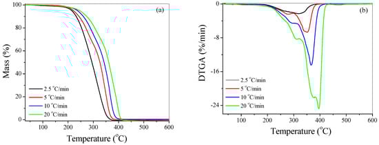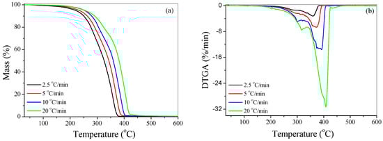 The heating rate efficacy on the thermogravimetric analysis (TGA) scans (a) and differential TGA (DTGA) curves (b) of neat PMMA.