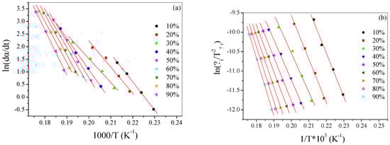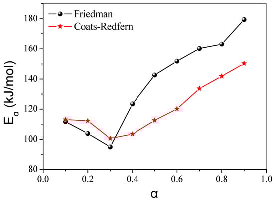 Isoconversional methods provide a variation of Eα with α usually employing multiple heating rates to obtain data on varying rates at a constant extent of conversion []. Taking the logarithm of Equations (2) and (4) can be obtained.