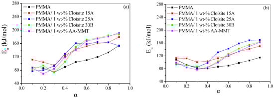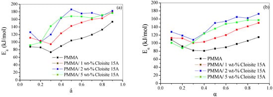 Figure 5 and Figure 6 show higher Eα values for all nanocomposites relative to pure PMMA at α values higher than 0.3. This observation confirms the higher thermal stability of nanocomposites compared to virgin PMMA that has been reported for the majority of them in our previous work [,]. In addition, the initial decrease of Eα at low α values and the following gradual augmentation verify the existence of a two-step degradation mechanism in each case. This observation could be associated with the presence of weak bonds in the polymer structure that may lead to a somewhat easy commencement of thermal degradation []. Once the weak bond cleavage is completed, the degradation process is governed by a random scission generally demanding higher activation energy values [].