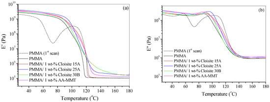 The viscoelastic properties of the pure PMMA and its nanocomposites were measured as a function of temperature by DMTA. The results obtained were based on the response of a given specimen to a cyclic deformation in function of the temperature at frequency 1 Hz. The dynamic mechanical properties for each material were determined again through a second scan under the same experimental conditions. Plots of the storage modulus, E′, and the loss modulus, E″, versus temperature for neat PMMA and its nanocomposites with different types of OMMT clay, according to the data of the second scan, are represented in Figure 8a,b. The same Figure also shows as indicative the first scan for pure PMMA. The peak detected for the first scan at ~73 °C is reasonably attributed to the relaxation of macromolecular chains which has been occurred during the molding process for the preparation of specimens. Similar behavior was also observed for all the corresponding nanocomposites. It is apparent that in the E′ curve (Figure 8a) the two regions where the E′ decreases abruptly for the first scan are replaced by a unique region throughout the second scan, that is, a glass transition region occurs. Moreover, the E″ shows a maximum peak in the second scan for the same reason (Figure 8b).