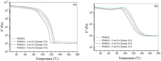 Storage modulus E′ (a), and loss modulus E″; (b) as a function of temperature of PMMA nanocomposites containing different OMMT types.
