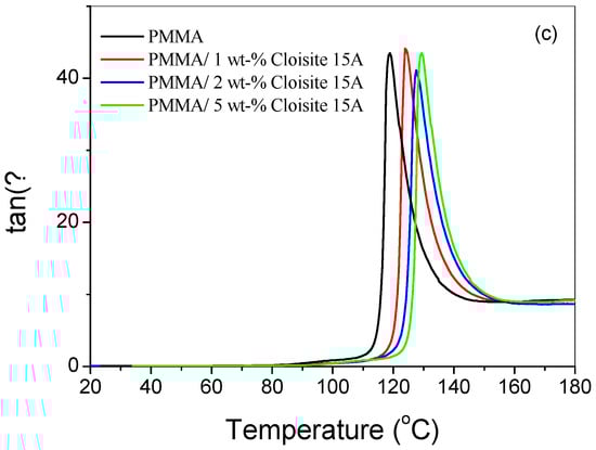 Storage modulus E′ (a), loss modulus E″ (b) and loss tangent tan(δ) (c) as a function of temperature of PMMA nanocomposites with different amount of OMMT clay.