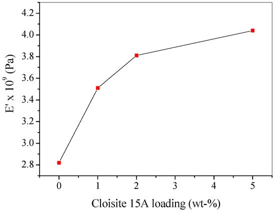 Effect of clay loading on the storage modulus E′ of PMMA nanocomposites at 25 °C.