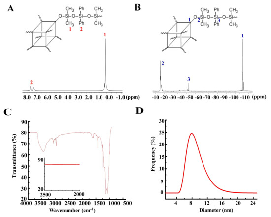 (A) the 1H-NMR of polymer 1 in CDCl3; (B) the 29Si-NMR of polymer 1 in CDCl3; The Q region was contaminated by the Q Si atoms in the NMR tube, and the spectrum was then flatten particularly in that region for the sake of clarity. (C) the IR of polymer 1 between 2000 and 2500 cm−1; (D) the dynamic light scattering (DLS) of polymer 1, showing the diameter of around 8 nm.