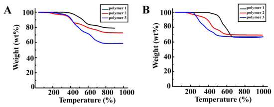 TGA plots of the polymer 1, polymer 2 and polymer 3 under the N2 (A) and air (B) atmosphere respectively.