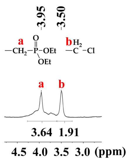 1H-NMR of polymer 3 and relative assignment of the peaks. The conversion of the chloropropyl groups into phosphonate-propyl groups was determined according to the integral ratio (Figure S7).