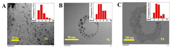 TEM images of nanoparticles of Au (A), Ag (B) and Pd (C) encapsulated within polymer 3. The distribution of particle sizes is shown in the insert of each image.