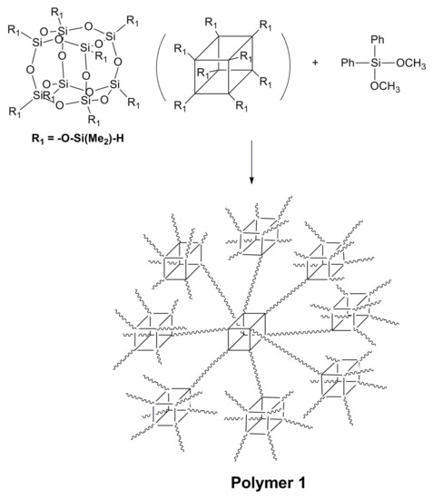 Polyhedral oligomeric silsesquioxanes (POSSs), as first synthesized by D.W. Scott in 1946 [1], have attracted considerable attention. POSSs are polysiloxanes consisting of the structure unit of (RSiO3/2)n, and they can exist in different forms, including amorphous, cage-type, dumbbell-shape, and ladder-structured ones [2,3,4,5,6,7,8,9]. Among them, cage-type POSSs have been investigated extensively, owing to their well-defined nano-sized structures. Polymers possessing POSS cages as structural subunits can have special properties, such as improved mechanical and thermal properties [10,11,12,13], and therefore the synthesis of such polymers has constantly been an attractive research direction.