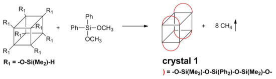 The structural feature of crystal 1 sheds light into the structure of polymer 1. As shown in Figure 2, the cyclopentasiloxane rings on the side of POSS cage in crystal 1 are all significantly distorted to one direction presumably due to the crowded surface of the POSS cage, and therefore the cyclopentasiloxane ring in crystal 1 should be more constrained than regular ones [40,41,42,43]. In other words, there will be lesser chance for the polymer to close up and stop growing due to the crowded space, and this facilitates the formation of high MW polymers. Only when polymer grows to a giant size, the intramolecular cyclization may happen due to the significantly reduced chance for intermolecular reaction with other reactive small molecules, and then the polymers stop growing. Combined with the absence of SiH or SiOMe groups, as supported by 29Si- and 1H-NMR, the end groups of polymer 1 are estimated to be mostly intramolecular loops. However it has to be pointed out that the possibility of other kind of intramolecular cyclization with polymer 1, other than the one shown in Figure 2 cannot be completely ruled out.