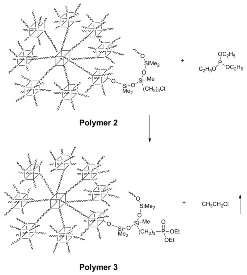 Synthesis of polymer 3: polymer 2 (100 mg) and triethyl phosphite (0.16 g, 0.98 mmol) were mixed and heated at 180 °C. After 48 h, the reaction mixture was concentrated and dissolved in 1 mL tetrahydrofuran. Excessive MeOH was added to induce precipitation. After additional MeOH washing, the white solid was dried under an oil pump (polymer 3, 0.025 g, yield 65%).