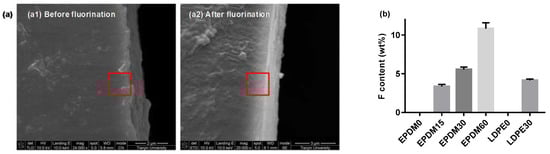 Scanning electron microscope of the ethylene–propylene–diene terpolymer (EPDM) and low density polyethylene (LDPE) cross-section. (a) SEM pictures; (b) fluorine contents.