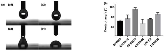 Hydrophobic properties of the fluorinated EPDM and LDPE. (a) Hydrophobicity measurement; (b) contact angle.