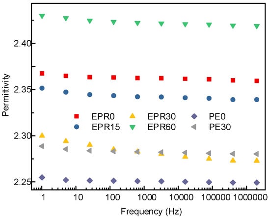 Lowering the relative permittivity of the polymer will make the transient electric field distribution in the composite insulation system more reasonable. The field strength distortion will be relatively reduced, which is more conducive to improving the dielectric strength and reliability of the composite insulation. The relative permittivity of the EPDM and LDPE samples modified by fluorination for different lengths of time was measured by the Novocontrol Concept 80, as shown in Figure 3. It can be seen from the figure that the relative permittivity of the EPDM and LDPE decreases slightly with increasing frequency, which is the dielectric relaxation phenomenon caused by the inertia of the molecule itself, and the viscosity of the polymer chains at a higher frequency. The relative permittivity of the non-fluorinated EPDM samples was between 2.36 and 2.37. When the surface modification time was increased from 0 to 30 min, the relative permittivity of the EPDM decreased from 2.37 to 2.28 at 50 Hz. However, when the surface treatment time increases and reaches 60 min, the relative permittivity of the sample reached 2.42. For the LDPE samples, the relative permittivity at power frequency decreased from 2.27 to 2.24, with the modification of the surface molecular structure for 30 min.
