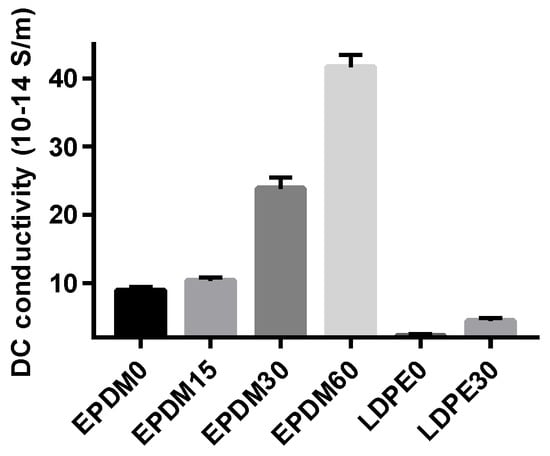 The conductance current can reflect many microscopic characteristics of carrier transport in the dielectrics, such as carrier injection, charge trapping and detrapping, trap carrier density, and the electric aging threshold, which are widely used in research of the semiconductor and dielectric materials charge transport process []. In this paper, the DC conductivity based on the final value of the conductance current was employed to reflect the effects of surface modification, as shown in Figure 4. The conductivity of the EPDM samples is generally higher than that of the LDPE samples, as the energy gap of EPDM (~6–7 eV) is much lower than that of LDPE (~10 eV). In summary, the conductivity of both the EPDM and LDPE samples measured at 20 kV/mm increases with fluoridation time. This is because the modification of the surface molecules causes the polymer surface to form a fluorinated layer consisting of –(CFn), which has a larger conductance [], resulting in an increase in the conductivity of the fluorinated EPDM and LDPE. At the other extreme, though the conductance is elevated by direct fluorination, the space charge is not inclined to accumulate at the interface or on the surface of the insulation system, which is a more serious threat to the safety of the HVDC cable operation.