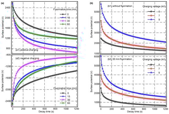 The surface potential decay process of samples with various fluorination time under different charging voltage levels. (a) Effects of fluorination time; (b) effects of charging voltage.