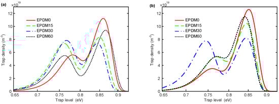 The surface trap distribution is calculated and summarized to analyze the effects of direct fluorination on the surface charge behaviors, whose calculation process is presented in Figure S1 (Supplementary Information). The results of the surface trap distribution, shown in Figure 6a,b, are similar to each other. There are two peaks of trap density—deep traps and shallow traps. The deep and shallow traps are relative. It is easy for the carriers in shallow traps to detrap, while it is harder to detrap from deep traps, which means deep traps have a higher probability of capturing space charges. The density of both deep electron and hole traps in neat EPDM are much larger than the shallow traps, indicating that mainly deep traps exist in EPDM, and these can be expected to capture charges on the sample surface and at the interface. Furthermore, the density of deep electron traps is higher than that of the hole traps, whereas the shallow electron traps have a lower density when compared to the hole traps. The energy distribution of hole traps in the EPDM implies that the hole traps are easier to modify by fluorination, but do not change much, while for the electron trap distribution, only 30 min of fluorination significantly affects the shallow trap density. In general, direct fluorination increases the proportion of the shallow traps for both the hole and electron traps, and decreases the density of deep traps.